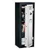 Includes 4 adjustable shelves . 3-number combination lock with a drill resistant, hardened steel plate behind the lock provides greater security . Black powder coat paint finish; door is silver gray with black silk-screen . Fastening hardware is included with each safe . Fully carpeted interior .E-059-SB-C-DS Size: 59" H, Lock Type: Combination Lock Features: -Solid steel, reinforced pry-resistant door provides greater security.-Pre-installed, fully carpeted interior.-3-Number combination lock with drill-resistant, hardened steel plate behind the lock provides great security.-Fire-rated to 1400 F for 30 minutes by ETL without the interior temperature of the safe exceeding 350 F. Includes: -Includes 3 adjustable shelves and fastening hardware to bolt the unit to the floor. Color/Finish: -Exterior features a black powder coat paint finish.-Door is silver gray with a black silk screen and chrome-finished hardware. Specifications: -3 Live action locking bolts and 3 steel dead bolts provide 6 locking points.
