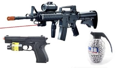 Full-scale replica of M4 automatic rifle compatible with 6mm BBs Looks, feels, weighs, and functions just like a real M4 rifle, but safer . Velocity of 250 fps; made of sturdy FPS plastic Comes packed with 100 pellets in attractive color box . Includes red laser, flashlight, and electric sight; 2 barrels . Airsoft Pistol: 180-FPS Flashlight, and Laser Airsoft Gun . 800 Count Grenade BB's .| Name | Detail |